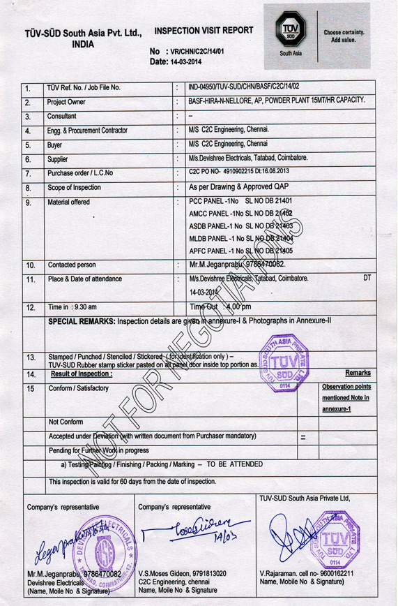 Our panel's were Inspected and tested by T�V-S�D South Asia Pvt.Ltd., India for one of our client.